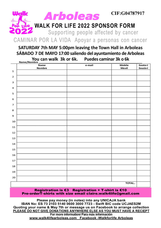 Sponsorship forms for the 2022 Walk for Life are now available. You can request one on our website walk4lifearboleas.com, by messaging on Facebook at Walkforlife Arboleas or by emailing claire.walk4life@gmail.com.