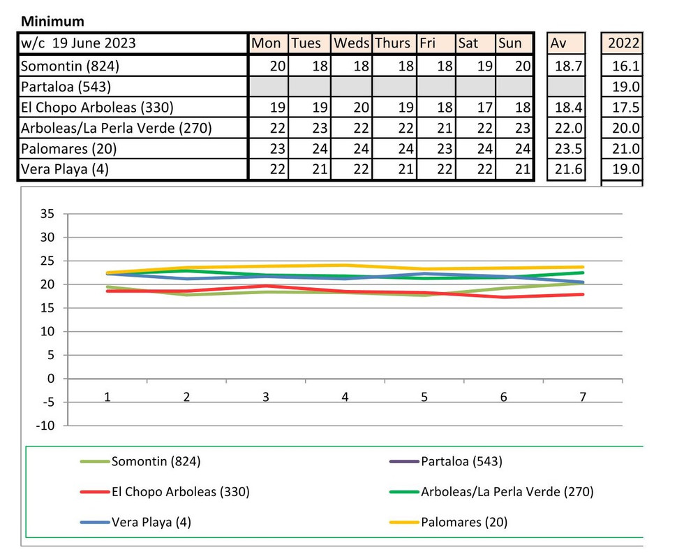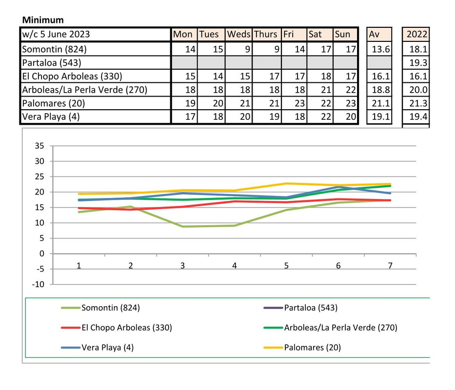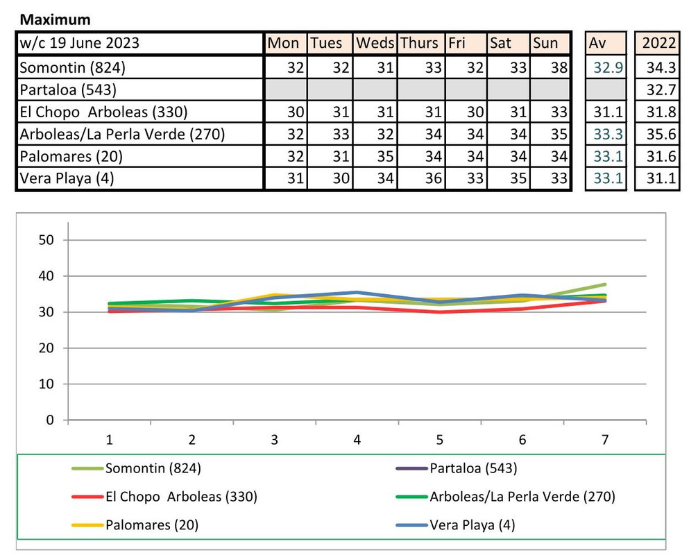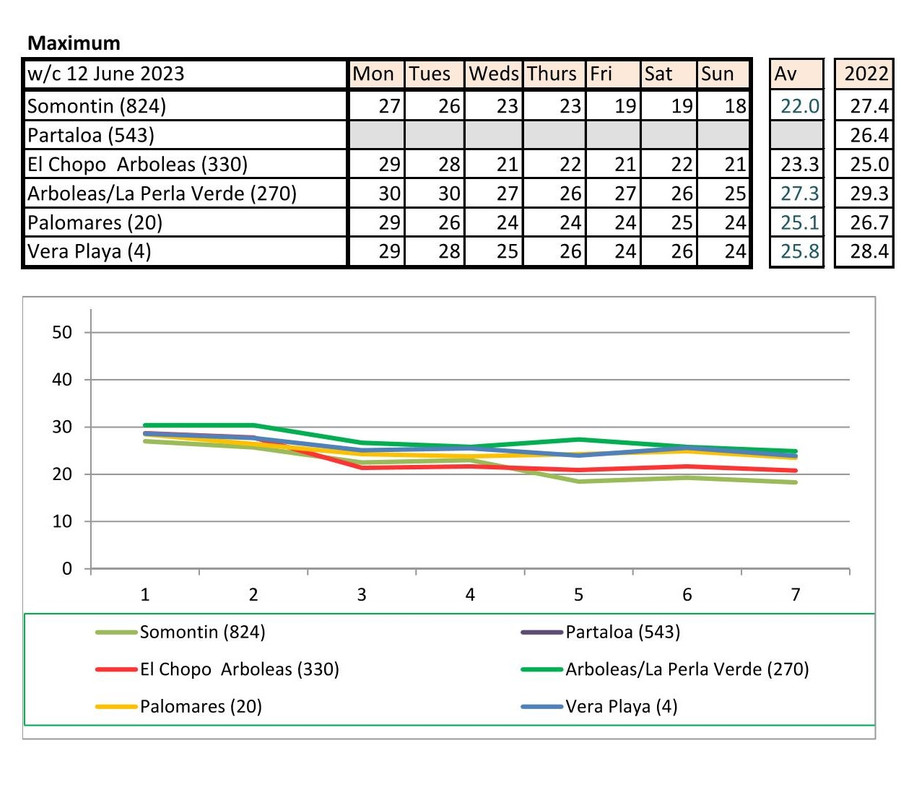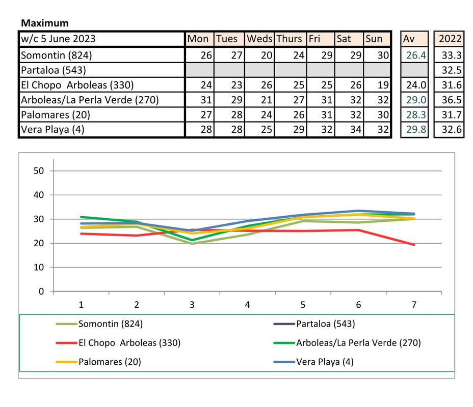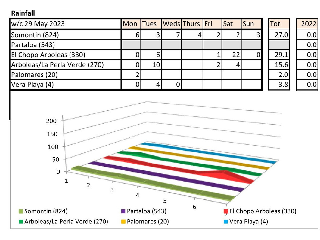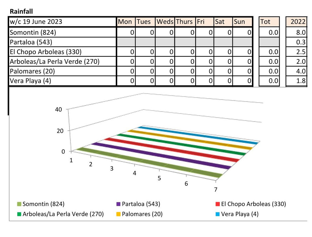 From 12th June. Warmer last year. No rain last year, trace of rain this year Vera Playa on Monday and Friday - .01.. doesn't show on graph