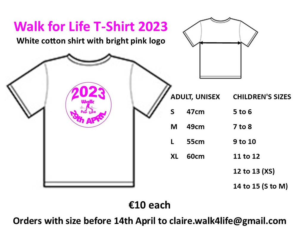 Walk for Life T shirts with the 2023 walk logo are available to order. Order before 14th April by emailing claire.walk4life@gmail.com. They will not be on sale on the day
