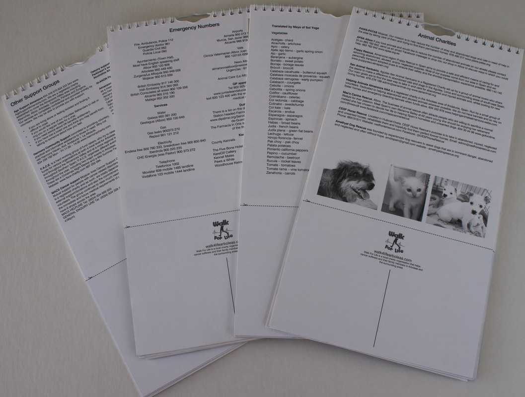 As well as 12 beautiful photos of this area it has all UK Bank holidays and Spanish National Holidays (Red Days). On the back each page is lots of invaluable information - emergency telephone numbers, market days and rastros, other support groups and charities with contact details, animal charities in this area with contact details, a translation of vegetables fruits and herbs, a page on places to visit and an alphabetical list of all the advertisers with their telephone numbers.