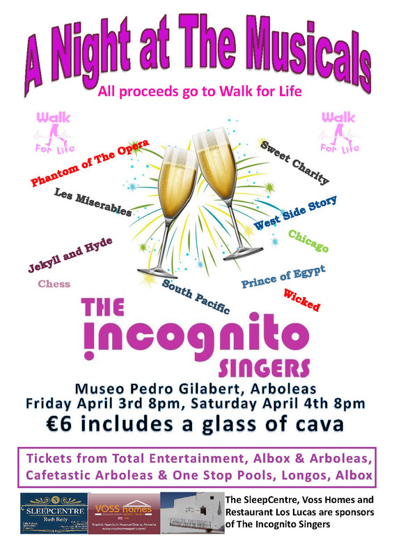 Let us Razzle Dazzle you with The Music of Broadway and The Rhythm of Life. For Some Enchanted Evening on Friday 3rd April and Saturday 4th April at 8 pm at The Museo Pedro Gilabert in Arboleas; those Stars, The Incognito Singers, will entertain you with The Music of The Night, A Broadway Medley, The Music of MGM and much, much more.